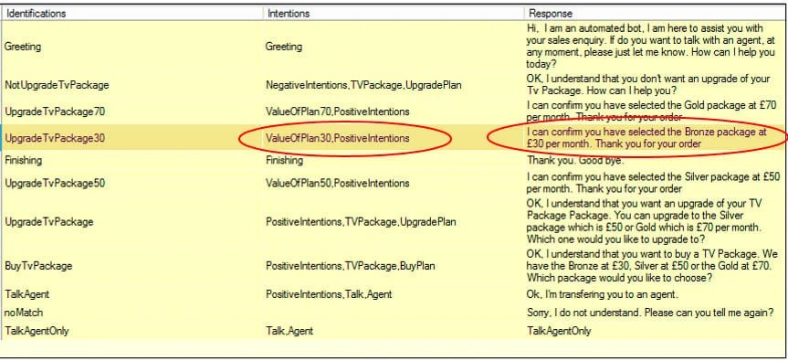 For instance, if the NLP system recognizes words belonging to the ‘Positive Intentions,’ ‘TV Packages,’ and ‘Upgrade’ intents, the amalgamation of these three categories enables the NLP system to ascertain the overall intent of the phrase. In this case, it discerns that the customer intends to upgrade their TV package, as illustrated in Figure 3.